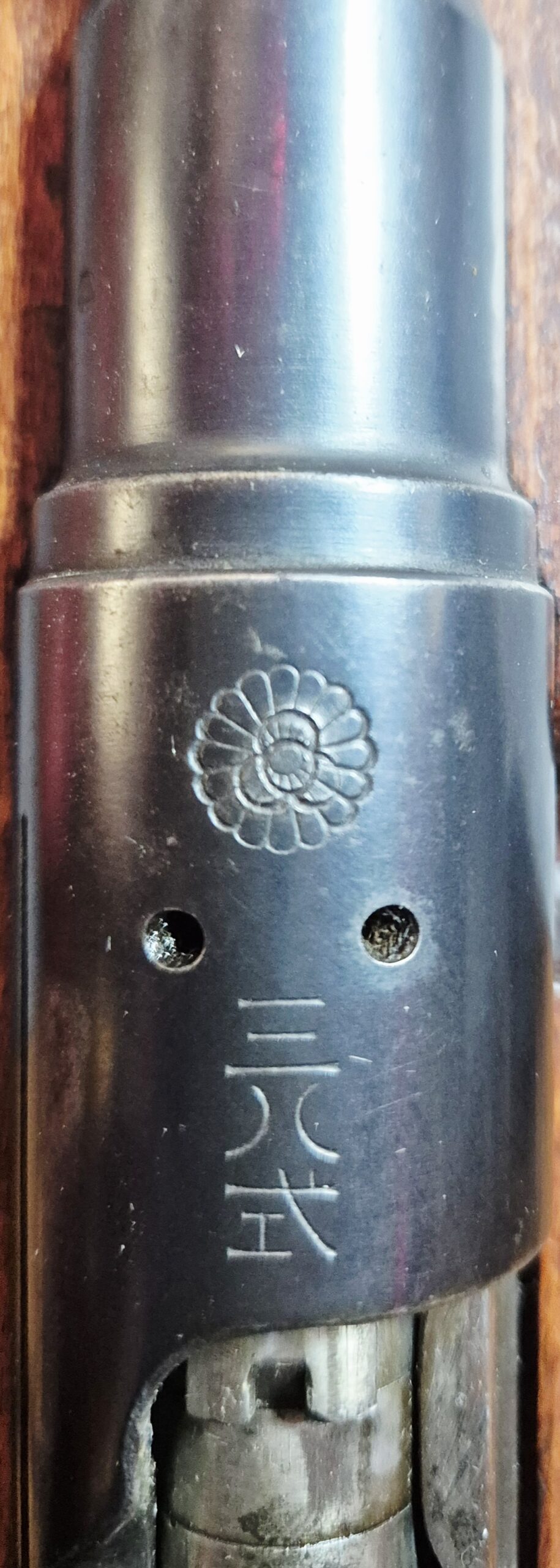 Arisaka Type 38 -karbiini. Type- 38 kivääri suunniteltiin keisari Meijin 38. hallitusvuonna (1905).  Japanin keisarilliselle armeijalle valmistettujen kiväärien lukon runkoon leimattiin yleensä 16 terälehdellä varustettu krysanteemi (Japanin keisarin symboli), mikä osoitti, että kivääri kuului keisarille. Japanin keisarikunta valmisti vuosina 1905–1945 6,5 mm:n Type 38 kivääreitä. kivääreiden krysanteemiin leimattiin Koishikawan (Tokion) / Kokura-arsenaalin symboli. Tästä aseesta ei ole hiottu ”Krysanteemia” pois, niin kuin usein näissä tehtiin. Karabiinit oli tarkoitettu mm. pioneereille ja ratsuväelle joille täyspitkä kivääri olisi ollut hankala kuljettaa.