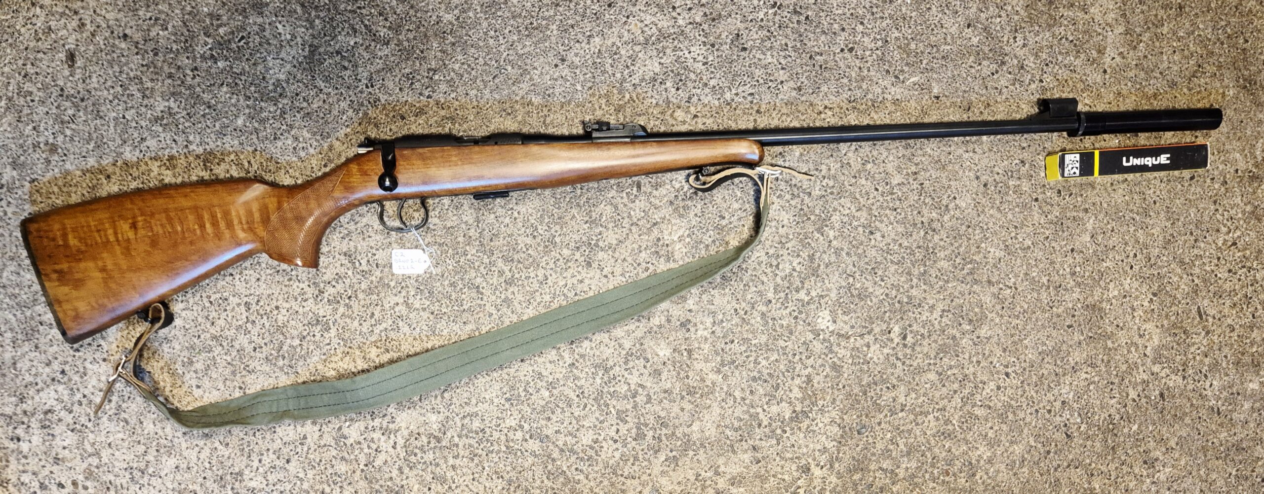 Brno 2-E pienoiskivääri, irrotettavalla lippaalla. Aseessa on äänenvaimennin kierteellä kiinnitettynä. Ase on kunnoltaan kuin uusi.