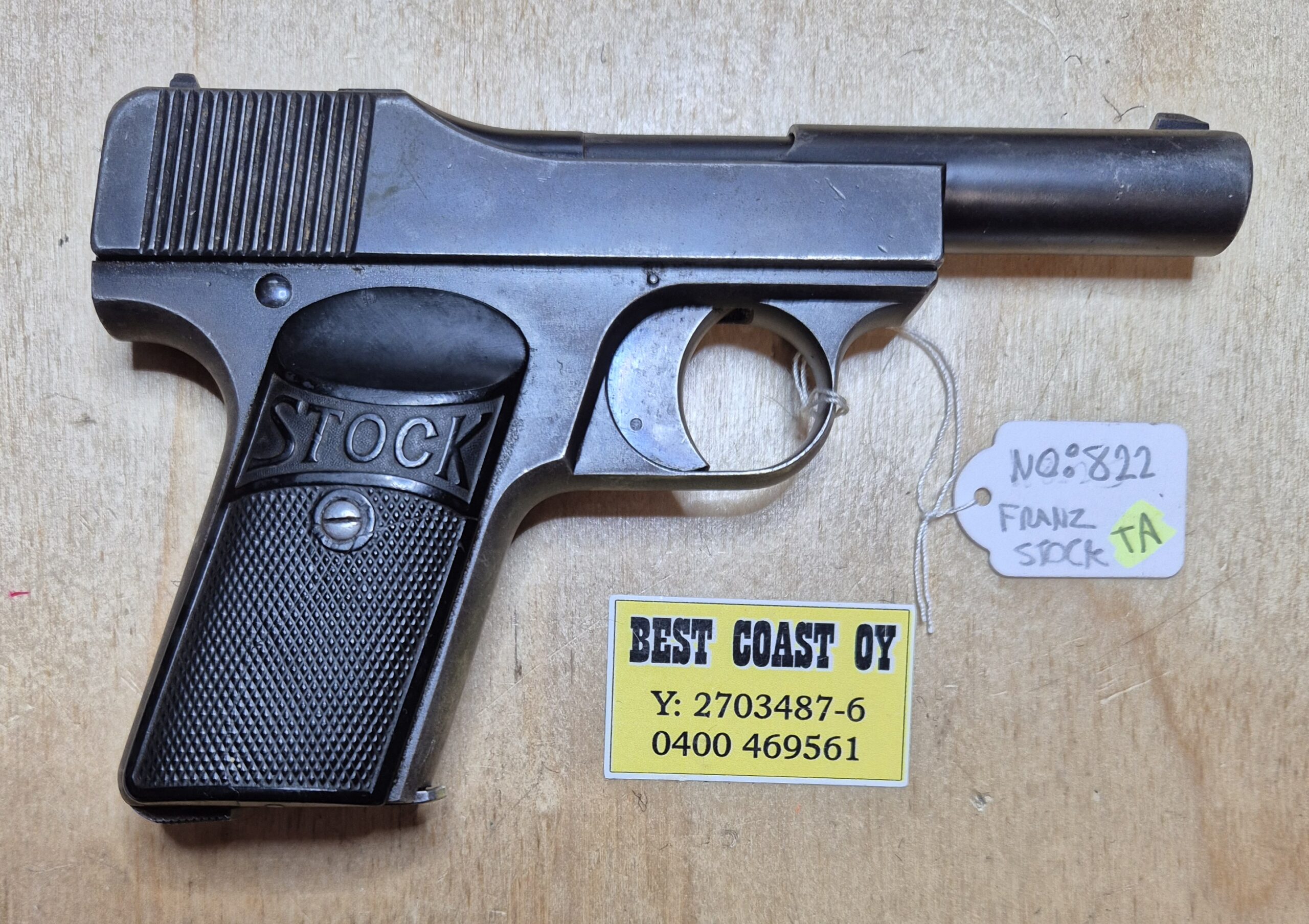 FRANZ STOCK-BERLIN. D.R.P. ”DRP” on lyhenne sanoista ”Deutsches Reichs Patent” ja osoittaa, että kyseinen tuote on patentoitu Saksassa. Franz Stock -pistoolit ovat hyvin tehtyjä ja luonnostaan ​​tarkkoja kiinteän piipun ja tarkkuusvalmistuksen ansiosta.