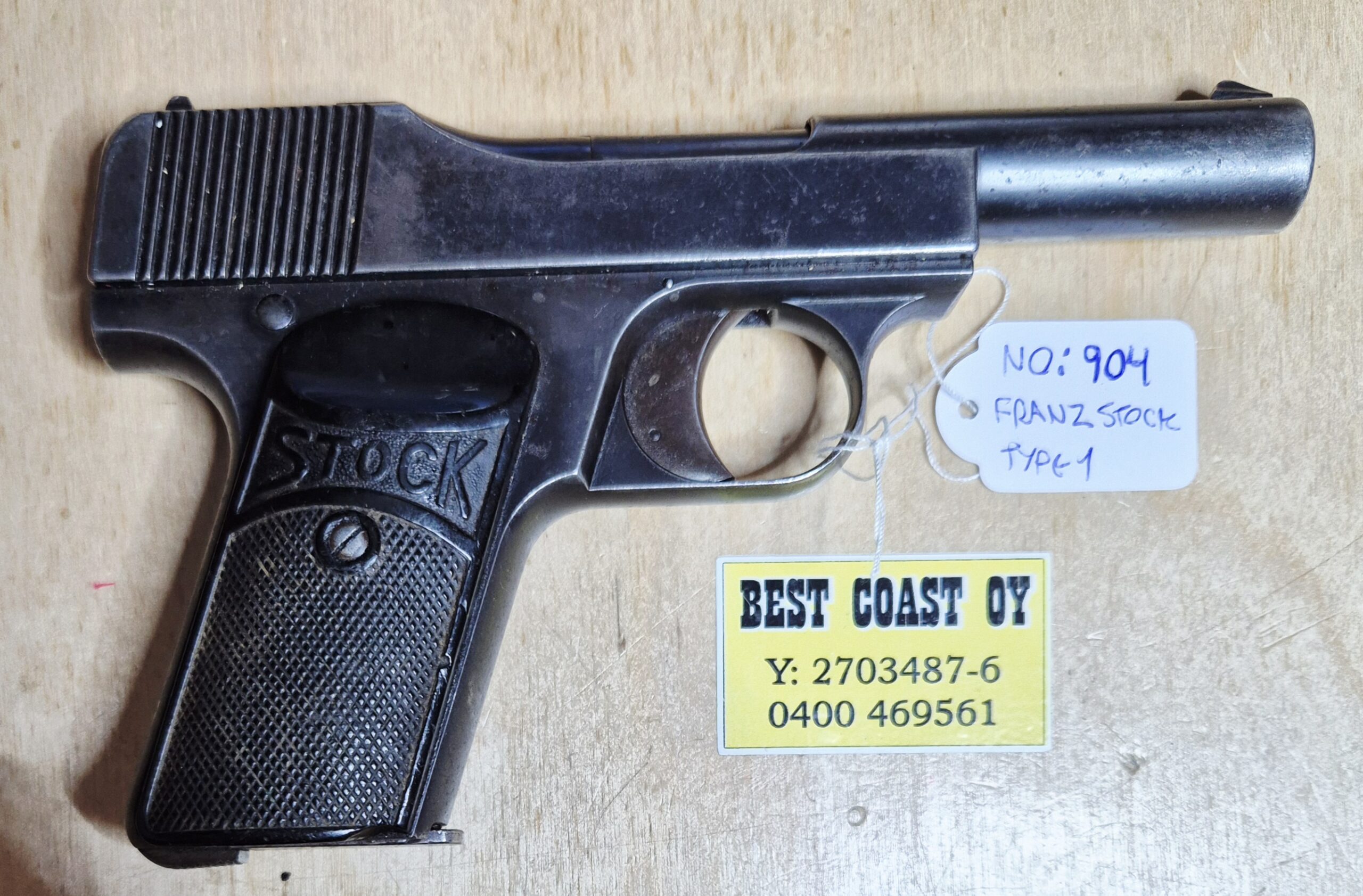 FRANZ STOCK-BERLIN. D.R.P. ”DRP” on lyhenne sanoista ”Deutsches Reichs Patent” ja osoittaa, että kyseinen tuote on patentoitu Saksassa. Franz Stock -pistoolit ovat hyvin tehtyjä ja luonnostaan ​​tarkkoja kiinteän piipun ja tarkkuusvalmistuksen ansiosta.