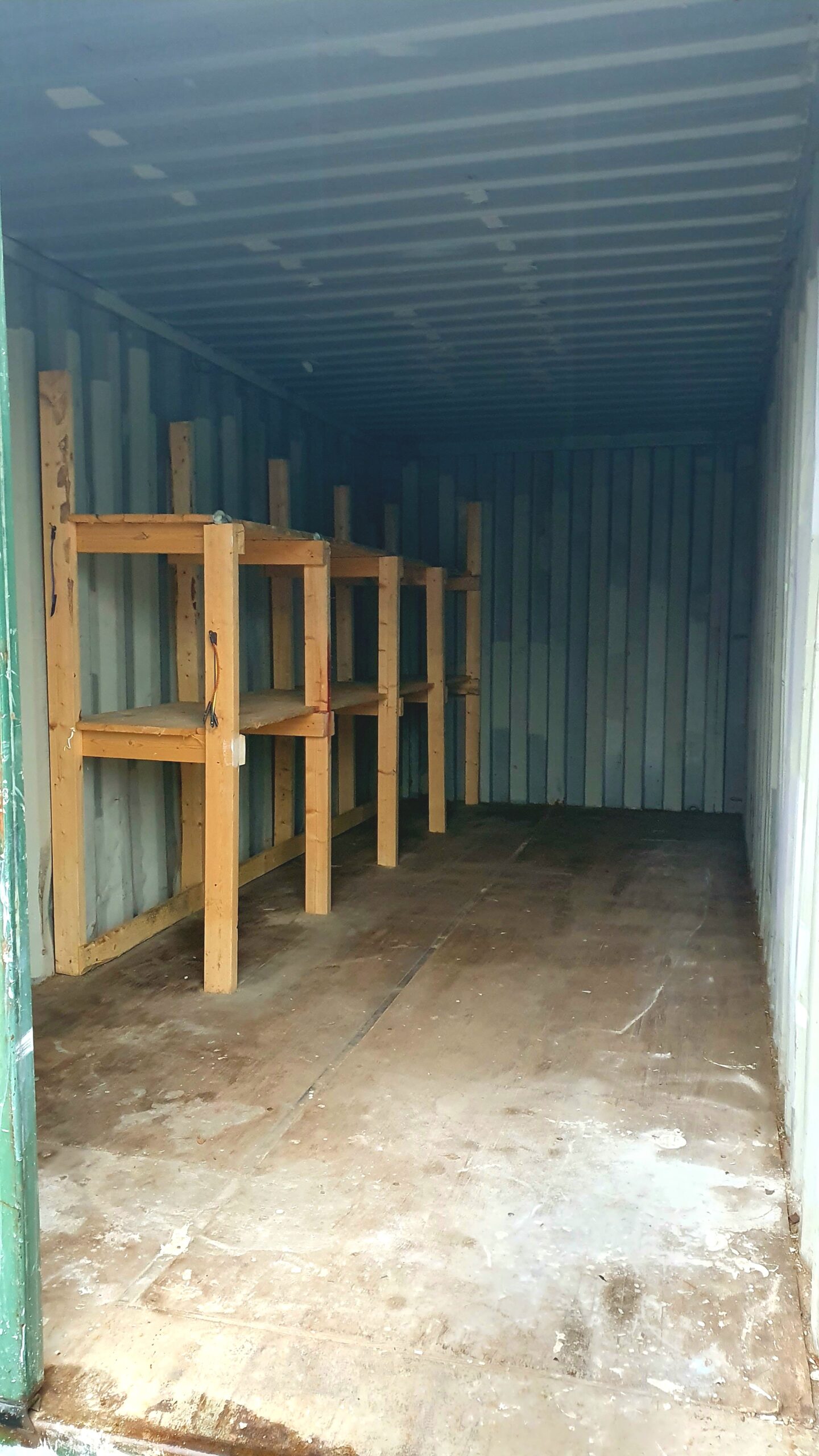 Käytetty 6m. merikontti varastoksi. Kontissa on sisällä puiset hyllyt toisella sivulla.