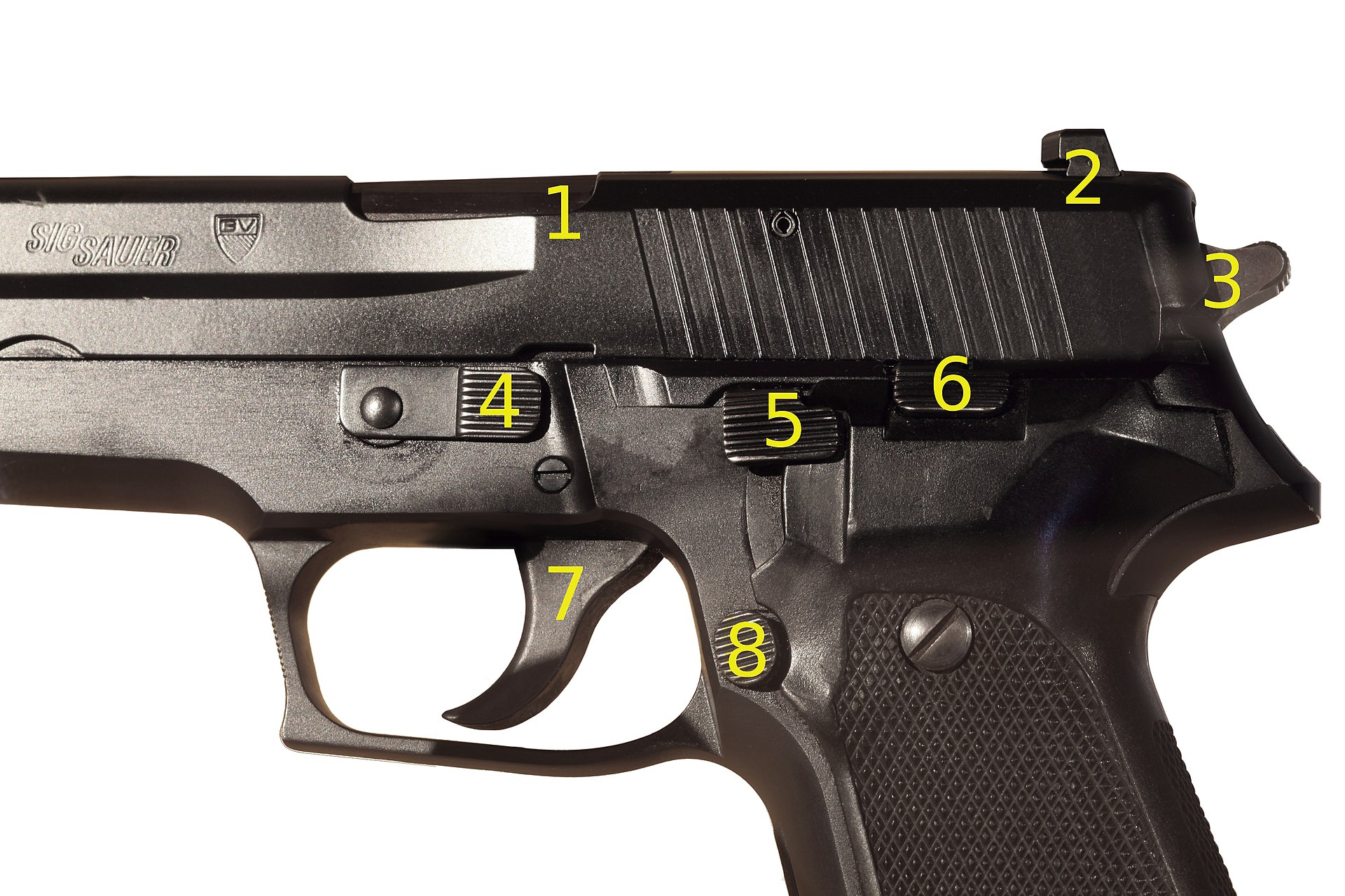 Kuvan numerodut osat: 1.Poistoaukko/lukitusolake, 2.Takatähtäin, 3.Vasara, 4.purkusalpa, 5.Decocker, 6.Luistin vapautin, 7.Liipaisin, 8.Lippaan vapautus.