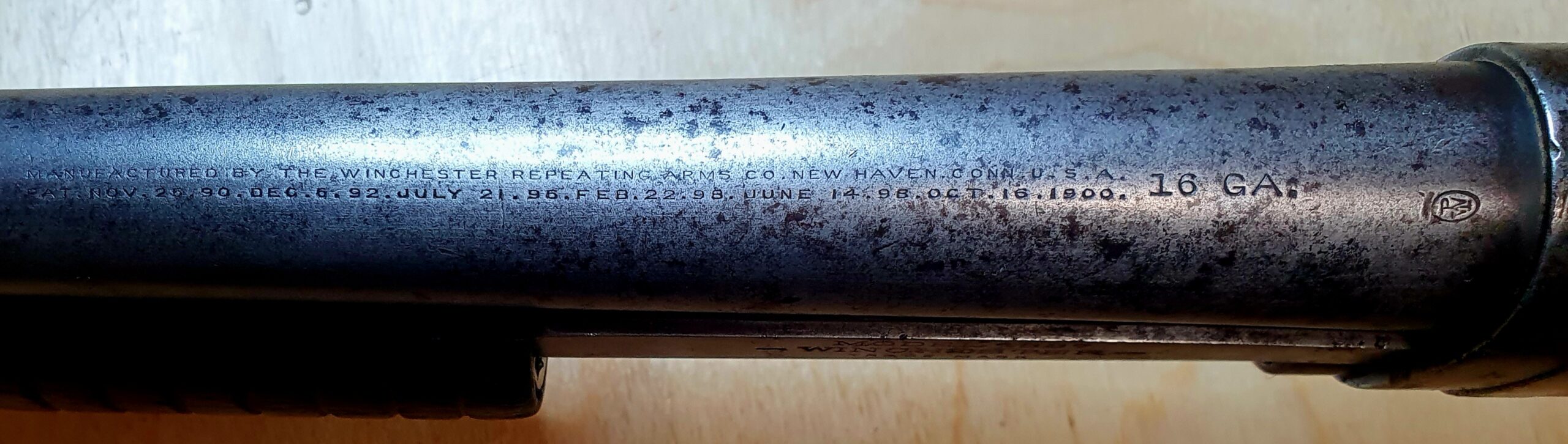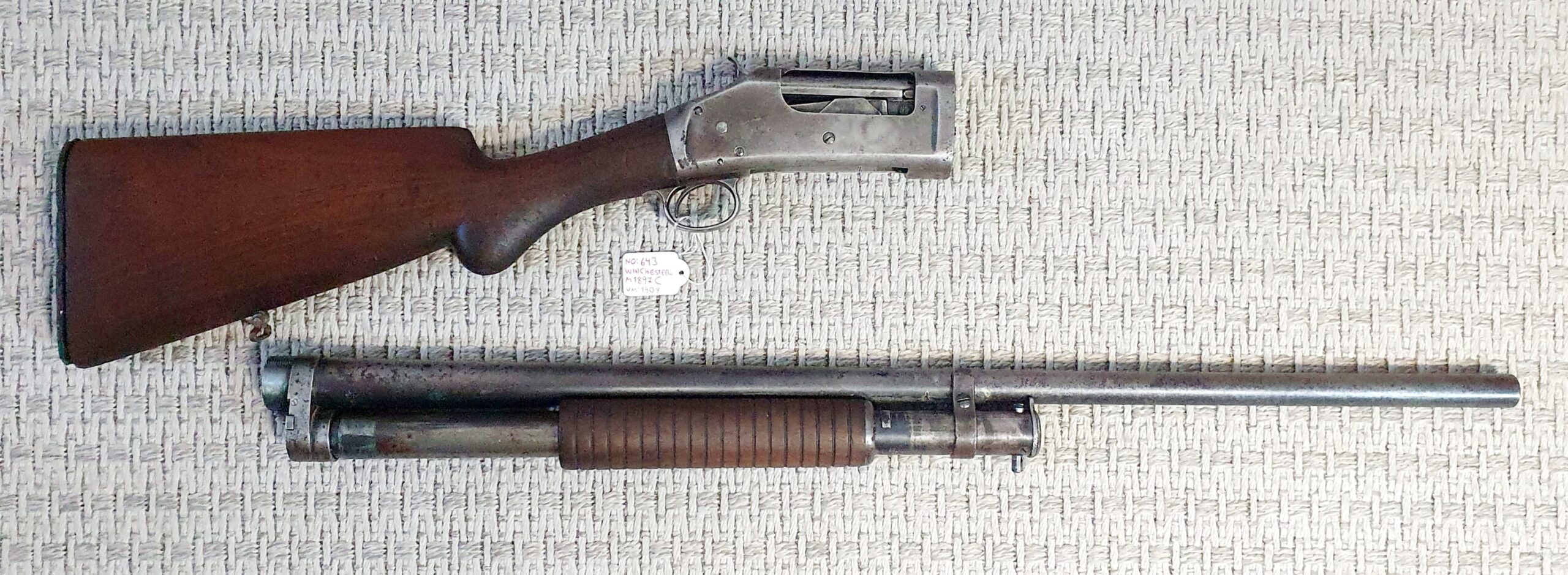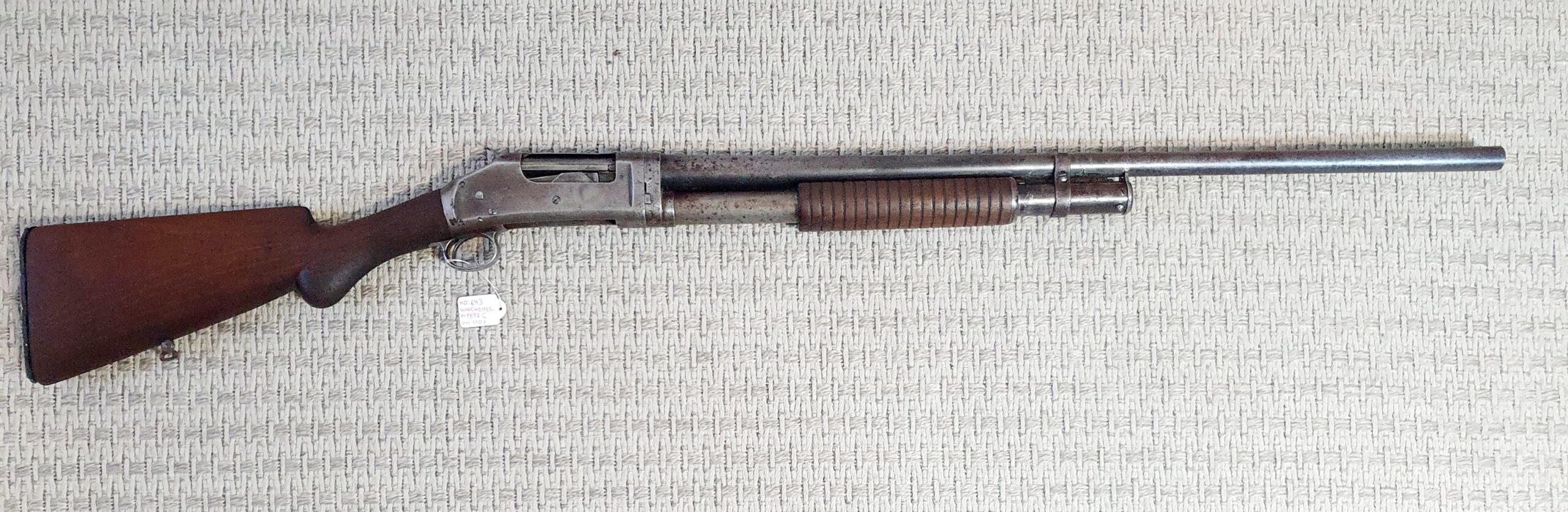 Legendaarinen Winchester 1897 Field haulikko. Aseen suunnitteli John Brovning. Ase on ”takedown” mallia, eli aseen saa purettua lyhyeksi ilman työväineitä. Mallia 1897 valmistettiin 60 vuotta, 1897 – 1957. Tämä kyseinen ase on valmistettu 1908. Asetta ovat käyttäneet sotilaat, poliisit, vartijat, metsastäjät, urheiluampujat, ym. Ase on tunnettu luotettavuudestaan. Aseella voi ampua myös liipasin pohjassa jolloin ase laukeaa aina latausliikkeen jälkeen, kun lukko on lukittunut. Tämä ominaisuus tekee siitä halutun. Etutähtäimenä on messinkinen helmijyvä. Tästä alkuperäisesta mallista on tehty myös kopioita maailmalla kovasta suosiosta johtuen.